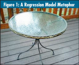 Consider the photograph of a table shown in figure 1. This is a finely built table I purchased at Wal-Mart for only $99 (chairs were included). In my metaphor, the table is a model. The legs of the table represent x variables, or predictors. The top represents the y variable, the predicted variable. My intent is to build a table where the top is well supported by the legs, i.e., the predictions are well explained by the predictors.