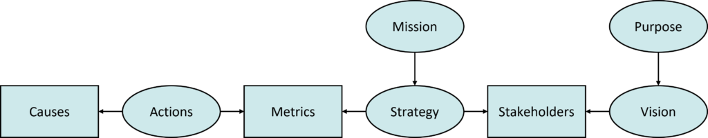 I define “management” as the process of aligning stakeholder interests to realize the organization’s mission, guided by its vision and purpose. The management process, as depicted in Figure 1, involves a blend of abstract goals (ellipses) and measurable elements (rectangles).